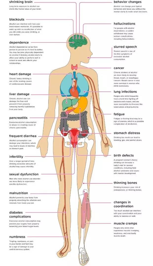 一夜的狂饮,让你原本心跳稳定的电信号产生混乱。如果这样酗酒很多年,你会让这些心电节律的改变成为永久性的改变,甚至,酒精可以让你的心脏停止跳动。随着时间的推移,它会导致心脏肌肉延展松弛,就像一个旧的橡皮筋。心脏就无法有效地泵血,这会影响你身体的每一部分。