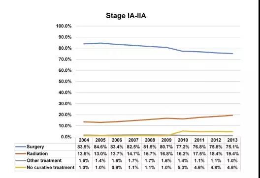总体手术率为79.8%。所有Ia期到IIa期肺癌病人手术率从2004年的83.9%到2013年下降到75.1%,具有显著差异 (p<0.0001)。其中: